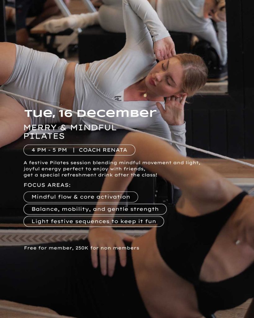 Celebrate the season with a Pilates class designed to connect movement, mindfulness, and lighthearted energy. Led by Coach Renata, this festive session blends gentle strength work, balanced flow, and core-focused movement — perfect for easing into the holidays feeling grounded and energized.